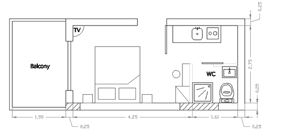 Studio (of one room) with bedroom - kitchenette, bathroom and balcony overlooking the garden.